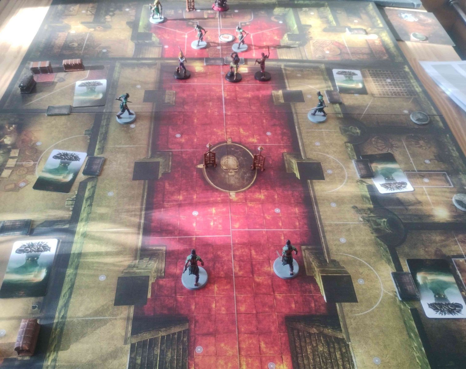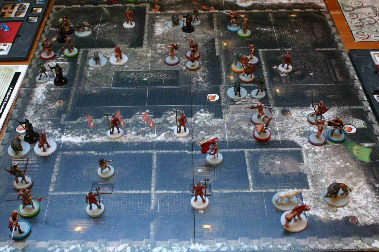 Et voici la deuxième partie de Conan des vacances de Noël, sur Toulouse cette fois ci. A 4, mais avec une overlordesse teigneuse et sans pitié... Nous nous sommes donc lancé à l'attaque de la porte de l'Aigle @Ken (scénario aventure n°2 des Clous Rouges). J'avais pour le coup fini à l'arrache la peinture de mes trois derniers héros. La mise en place qui rend très bien sur cette magnifique carte (mais moins sur la photo !) : Nos trois héros se lancent à l’assaut du pilier numéro 2, coté coffres, car il est bien évident qu'il nous faut trouver le coffre des calumets pour pouvoir atteindre la salle du trône et son pilier à abattre. Une corde vite nouée pour grimper : Mais nous n'avons pas eu trop de chance. L'évènement correspondant à cette pièce a fait apparaitre un point de renfort sur cette zone, zone qui contrôle l'entrée et la sortie des trois pièces contenant les coffres. Nous avons sans doute commis une erreur stratégique. Conan est resté dans cette zone pour éliminer les guerriers Xota, qui sont une vraie teigne, avec 2 de défense et une bonne attaque. C'est clairement une unité de renfort 2, mais elle est chiffrée à 1. Et donc elle repope constamment sur la porte qui nous bloque du mauvais coté avec les 2, puis 3 points de renfort de l'overlord. Même avec l'hallebarde, Conan n'en pouvait plus ! Sur la photo , Valéria est sortie, et Techotl est partie avec les calumets. mais trop de temps perdu, et surtout trop de gemmes en blessure. Conan avale potion sur potion, mais il n'a déjà plus que 2 points de vie. Valéria, tentant de couvrir Conan en se tenant juste derrière lui, fini transpercée dans le dos (Rah, vile overlordesse) par un chasseur Xota. Conan, sentant la fin arriver, n'a plus la force d'utiliser la corde. Il se jette du balcon, se brise une jambe, et achève le vil chasseur qui a osé tuer Valéria. Tetchotl découvre le premier escalier, qui est un faux, puis découvre Tascela et son sort maudit, et fini (en invoquant les Dieux et en profitant que l'Overlord regarde ailleurs) par identifier le bon escalier. Il court, court, la salle secrète, La porte bleue, la salle du pilier. Pendant que les chasseurs Xota se rappliquent tranquillement par la porte principale qu'ils savent ouvrir... Et ils transpercent Tetchotl devant le pilier... Le retour sur la partie : Coté Overlord, un gros enthousiasme, et le coté "rejouabilité" avec les cartes surprises lui a beaucoup plus. Coté joueurs, ces cartes sont amusantes, car on ne sait pas ce que l'on va découvrir. Par contre, ca rend la partie plus ou moins difficile (même si j'avais préparé le paquet de cartes en incluant dans la bonne proportion les cartes "troupes", "lieutenant" et "vide" pour éviter de tomber sur une mauvaise configuration. Le fait de tomber sur une zone renfort à cet endroit à été très difficile à gérer, et en plus, il est probable qu'on ai mal géré cette difficulté. On aurait du se disperser pour attirer les guerriers plus loin, au lieu de rester dessus pour tenir la porte. Bref, partie difficile, à rejouer en étant plus fin sur la stratégie ! Ma recommandation est quand même de pré trier le paquet de carte surprise, pour avoir éviter des situations trop défavorable ! Et de bien clarifier le montée à la corde, je pense qu'on la mal joué au début, en considérant que les 2 points de mouvement étaient "supplémentaires", or ca semble être le total à dépenser
