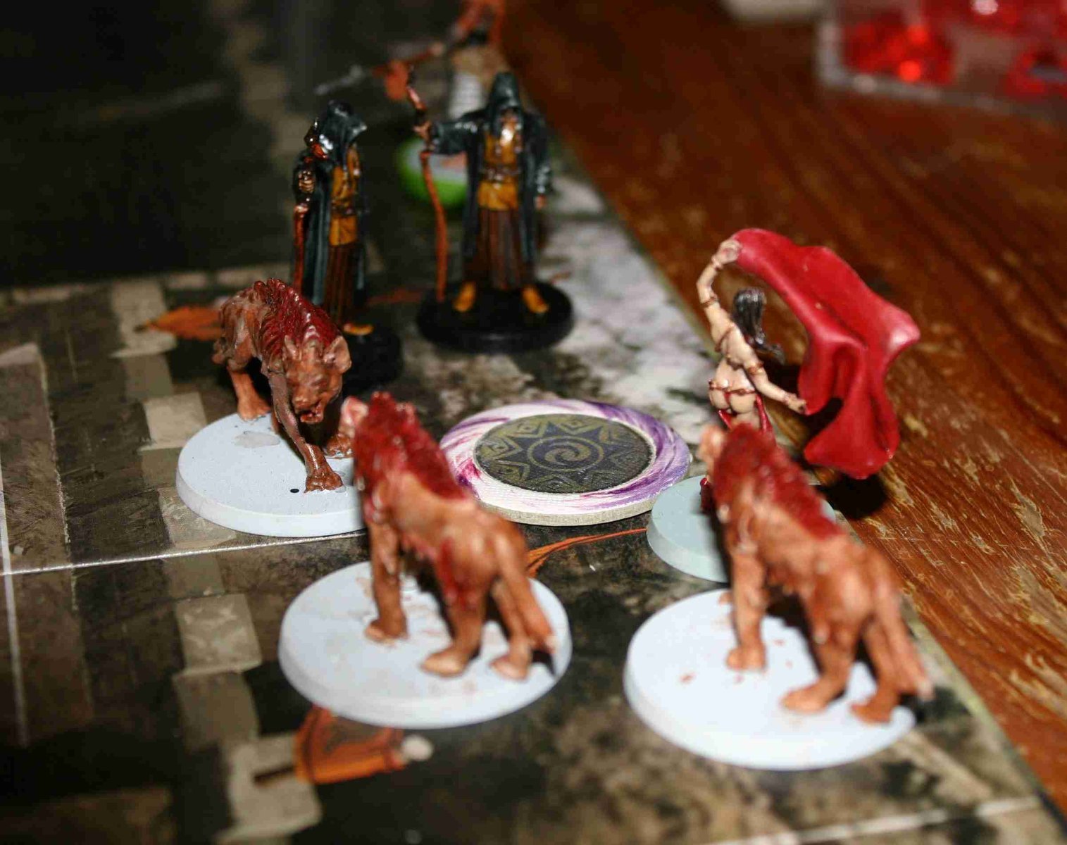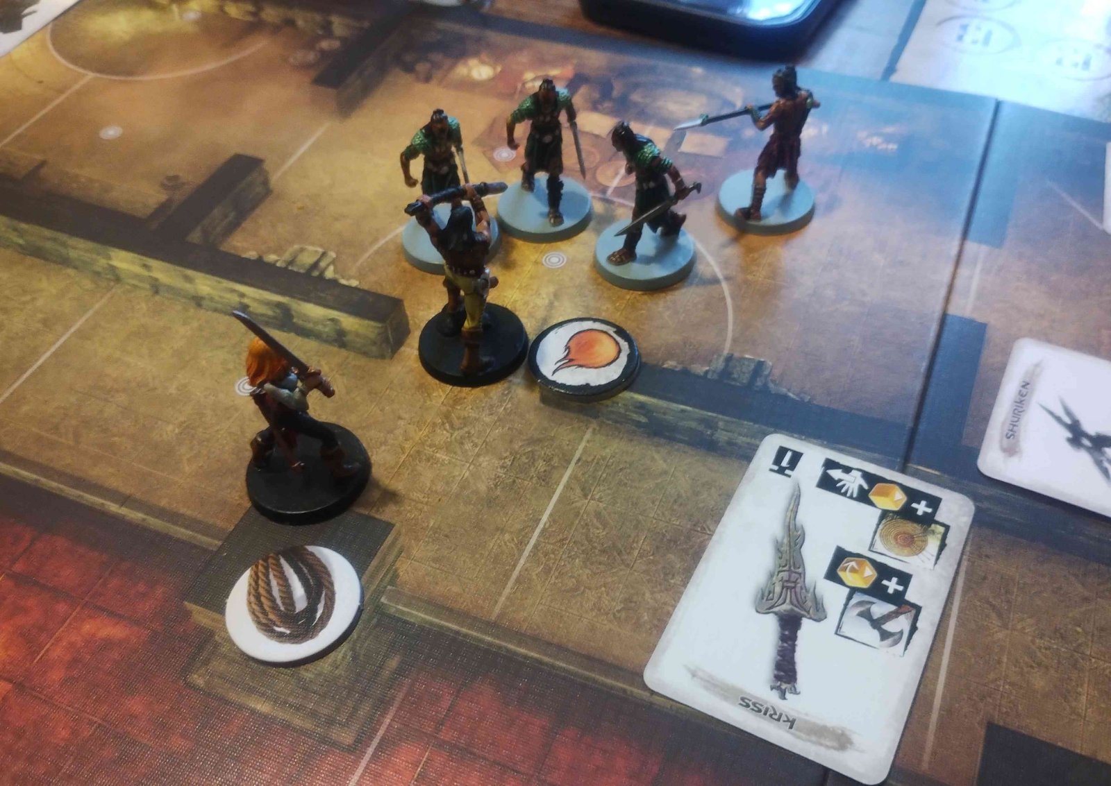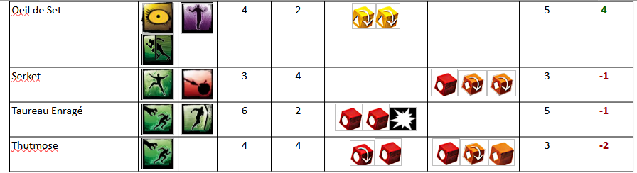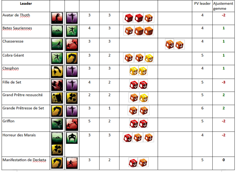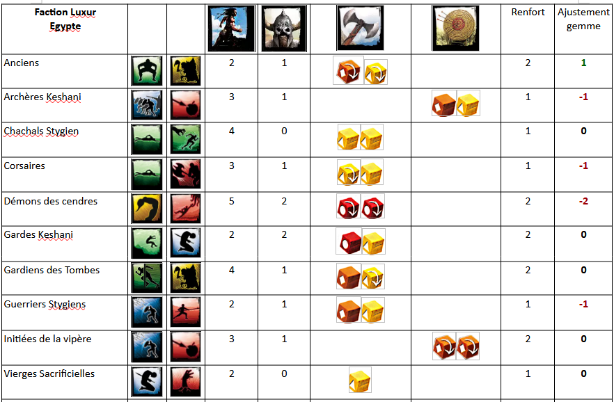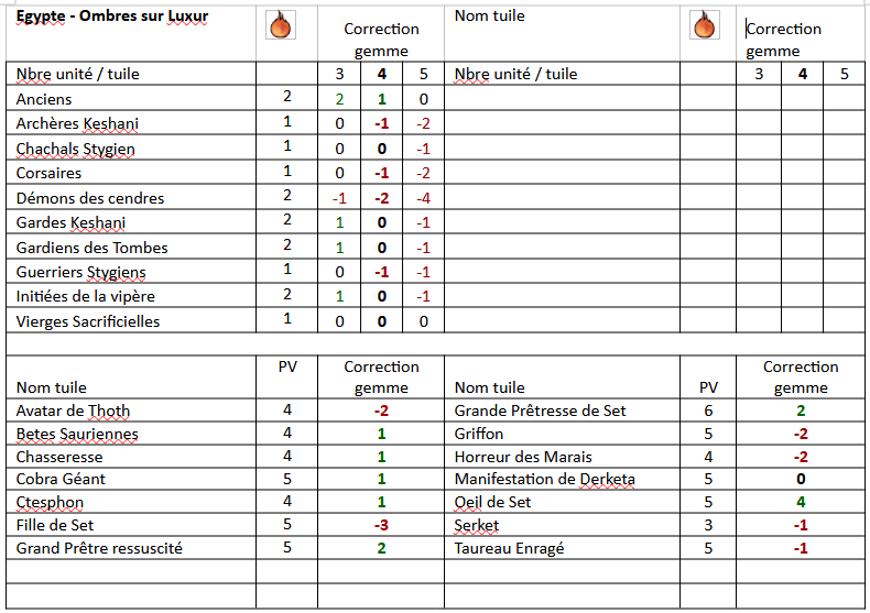 Testé ce dimanche avec Isabelle. Une équipe de "filles" : Zelata emmène ses fidèles compagnes, quelques hommes en robe et ses animaux sauvages pour sauver son amie Zenobia. 1 2 3 4 5 6 7 réserve type Sbire Champion Leader Sbire Champion / Elite Event Sbire Second leader Nbre 4 4 1 4 4 4 1 Chasseuses Xota Acolithe Khitien def 2 noir Zelata Chiens de Fo Loups Géants Hyènes Zénobia Ajustement -2 -1 3 -2 1 0 3 Contre une équipe de l'Amour ! Khemsa vient délivrer sa compagne Gitara, aidé de troupes orientales de son pays et de quelques mercenaires. 1 2 3 4 5 6 7 réserve type Sbire Champion Leader Sbire Champion / Elite Event Sbire Second leader Nbre 4 4 1 4 4 4 1 Gardes Khitan Javeliniers Khemsa Gundermen Gardes d’honneur Mercenaires Kushites Gitara Ajustement 0 1 2 -2 0 -2 2 Avec les aménagements proposés : pas de compétence Vol, Insaisissable, Fascination pour le prisonnier, le premier jouer commence avec 7 gemmes en fatigue (2 après récup), et il faut réussir une manipulation complexe de difficulté 2 pour ouvrir la porte de la cellule. Au premier tour, les deux premières tuiles de chaque joueur utilisent la règle saccage. En fait, ne pas l'utiliser fait prendre le risque que l'autre le fasse et donc ai un avantage supplémentaire. Bref, au premier tour, les deux adversaires arrivent à libérer leur prisonnier, moyennant quelques relances pour ouvrir cette porte. A noter que le garde devant la porte n'impose pas de gène, car au début du tour, on peut activer jusqu'à deux gardes ! Pour la suite de la partie, Gitara progresse plus vite Zenobia, car celle ci est bloquée par un garde Khitan bloqueur. Qui plus est, comme elle n'arrive pas à franchir le point de renfort, je vais faire revenir les bloqueurs par ce point pour continuer à la bloquer. Arrivé au 5ième tour, je tente une échappée en déplaçant Gitara sur la case de sortie. mais il lui manque un point pour sortir. Et j'ai tout dépensé (plus de gemme). Qu'à cela ne tienne, je pense pouvoir sortir au coup d'après (la carte event est en position 5, ce qui me permettra de la réactiver), moyennant sa grâce féline, ses 5 points de vie pour survivre aux attaques et une aide potentiel d'un garde d'élite proche de là. Mais la vile Zelata envoie ses hyènes qui tentent de mordre ma Gitara. Celle ci esquive magnifiquement et avec grâce telle une ballerine dans un spectacle de tauromachie ! Mais les deux acolithes Khitans ne sont pas du même bois ! Le premier envoie 4 dégâts (le max sur deux dés oranges), et le deuxième 3. Ma défense me fait défaut, et Gitara échoue à sortir, les doigts accrochées au bord de la carte !!! Victoire pour Zelata, qui parviendra de plus à sortir Zenobia au tour suivant (on joue toujours un tour de plus pour voir si c'est équilibré). Belle partie, tenue en 6 tours ! (à condition de choisir des rivières équilibrées !!!)