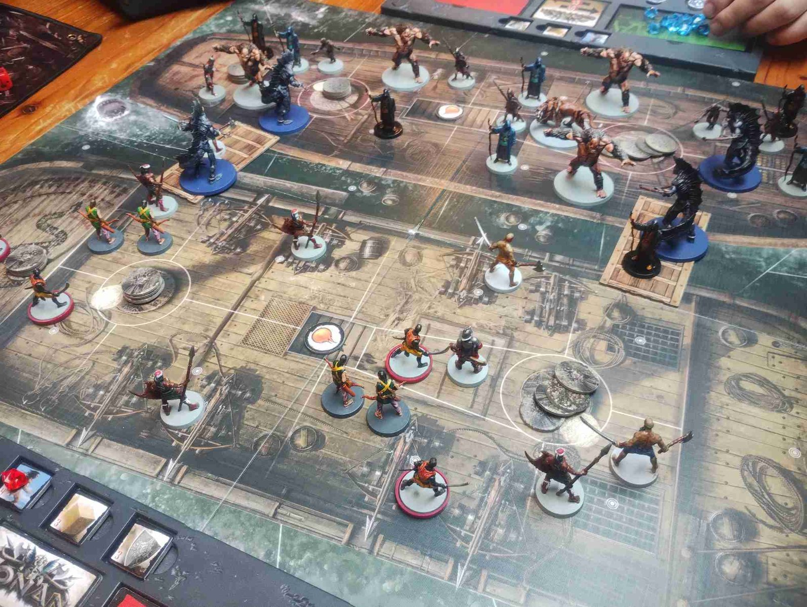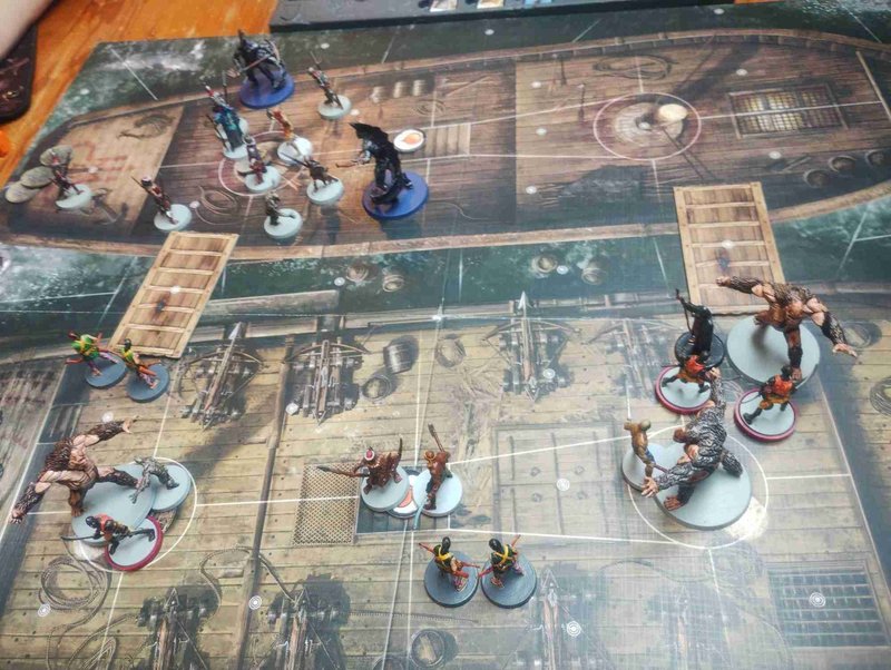 Partie jouée ce week end ! Voici les deux rivières que l'on a choisi. Les pirates, qui ont recruté des profonds, pour pouvoir piller l'épave engloutie. L'équipe de choc est constituée de Zapo et des profonds, capable de détruire les instruments à 1 case grâce à allonge. 1 2 3 4 5 6 7 Archers Pirates Profonds Zaporavo Gardes de Belit Forbans Event Pirates def 1 0 -2 -1 0 1 Event 0 De l'autre coté, on a un équipage asiatique, qui a dressé des animaux de diverses contrées, et qui espèrent que leur squelettes pourront avantageusement fouiller l'épave engloutie sans respirer. Ici, l'équipe de choc est constitué de ces monstrueux hommes singes. 1 2 3 4 5 6 7 Vers de la Terre Children of Gullah Tigre à Dent de Sabre Acolytes khitiens blanc def1 Acolytes khitiens noir Event Squelette def0 0 -6 3 0 -1 Event 2 On a donc une équipe, avec une tuile troupe très forte (enfant de gullah), équilibrée par un leader faible (le tigre) à l'opposée, une équipe avec Zapo et les profonds, une peu fort, équilibrés par des troupes un peu plus faible. Comme les deux troupes ont le même ajustement en gemme, on laisse la mise en place de départ. Voici la fin du premier tour du premier joueur : Mes profonds ont déjà bien avancé, et commencé à détruire les équipements adverses. La partie se mène de manière très équilibrée, chacun ayant tantôt un jeton de plus, tantôt un de moins que l'adversaire. Au 7ieme tour, il me reste 5 jetons à détruire à la poupe, et 4 pour mon adversaire, tous répartis sur les 3 zones. Mais la fin se profile au huitième tour, lorsque je ne m’aperçois pas que les maudits singes peuvent tous rejoindre un des 4 instruments qui restaient Et d'un coup, ils achèvent mon beau bato !!! Si j'avais joué le tour d'après, j'aurais abattu 3 jetons de plus... Bref, partie très équilibrée, tendue jusqu'au bout et passionnante ! Les modifications apportées : 1/ Mise en place de départ, le premier joueur commence avec 4-7 gemmes 2/ Reformulation de la règle à l'abordage : Lors de son prochain tour, le joueur peut activer une troisième tuile avec un coût d’activation augmenté de 3 pour celle ci. Ca ne change rien au principe, c'est juste que comme ca, on peut décider après les deux premières activations, si on active la troisième ou pas. C'est plus pratique.